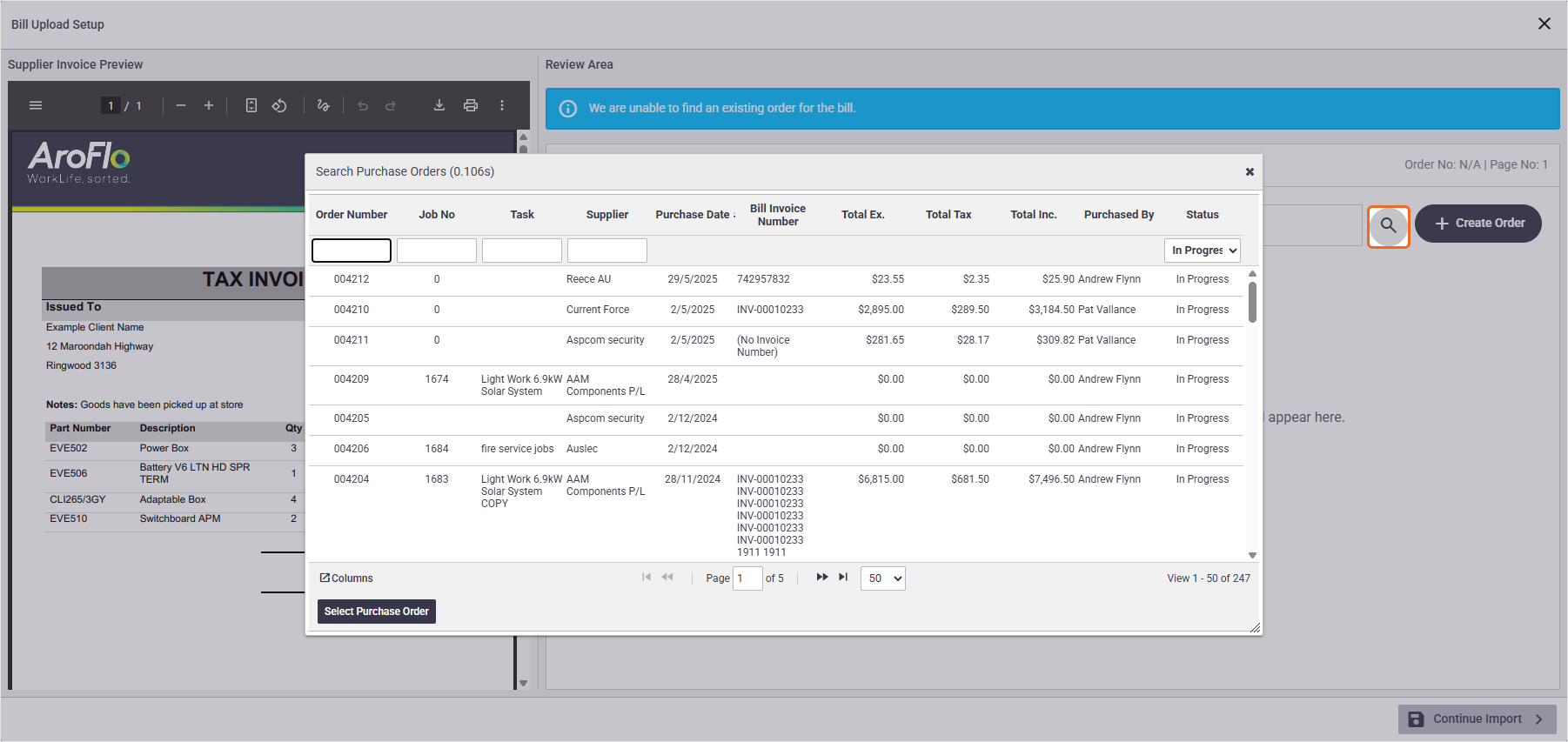We've added an advanced search option when using the Bulk Upload Bills feature and looking for an existing order to link your upload to. This is useful if you can't find the order you need when using the basic search. The search window includes a Bill Invoice Number column which is useful to check if the order has already been billed.
