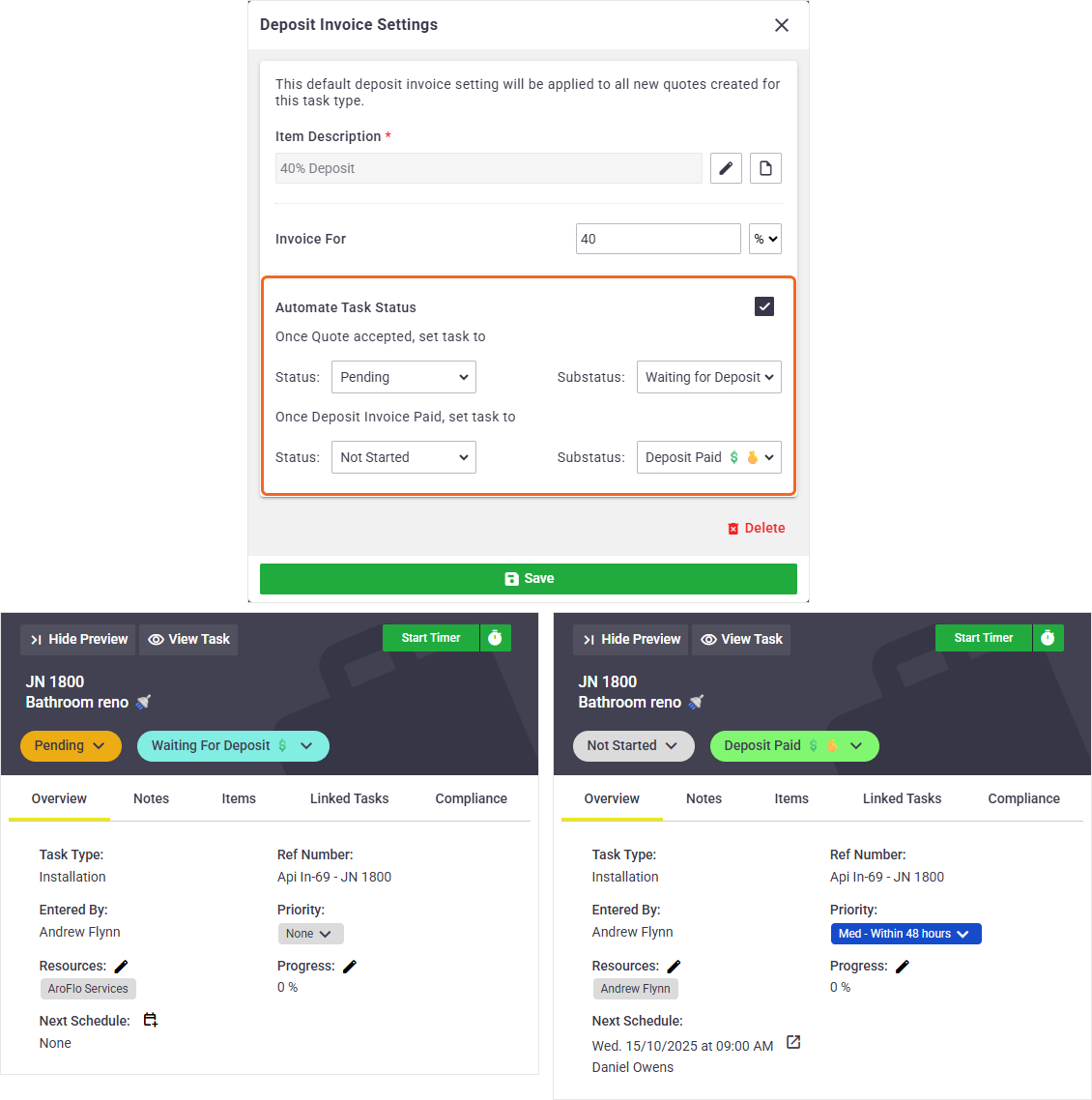 On the topic of Deposit Invoicing, you can now choose to automate an associated task's status and substatus, both once the quote is accepted and once the deposit invoice has been paid. For example, once your client has accepted a quote, you might want the task's status and substatus to be set to Pending - Waiting for Deposit, and once the deposit invoice has been paid, the task could move to Not Started - Deposit Paid.