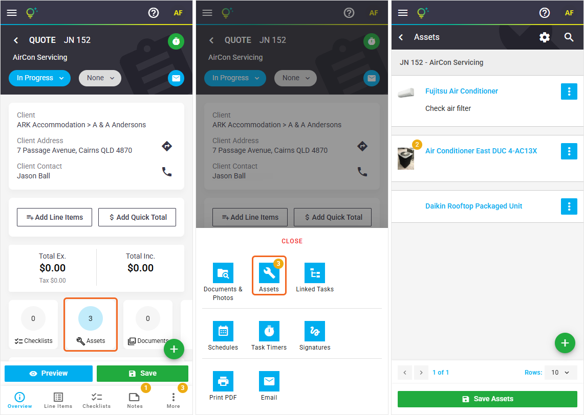 Look for the Assets tile on a Quote or the More tab > Assets.