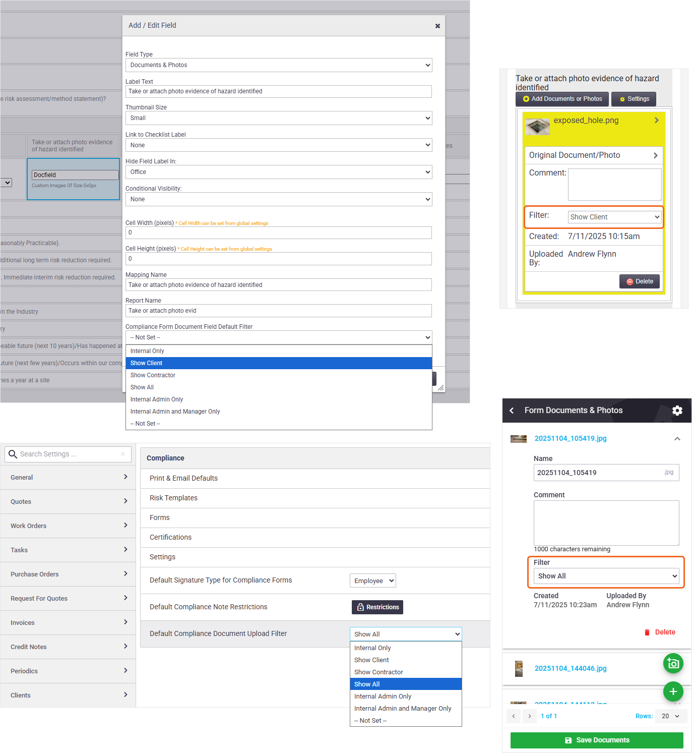 We've introduced a default filter for Documents and Photos uploaded to Compliance Forms. This is useful if you want to use a different filter to your overall default, set in Document and Photo Settings.