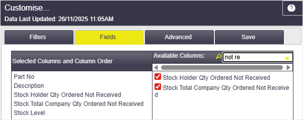 - Stock Total Company Qty Ordered Not Received - Shows how many of each item has been ordered but hasn't yet been received, for your whole company