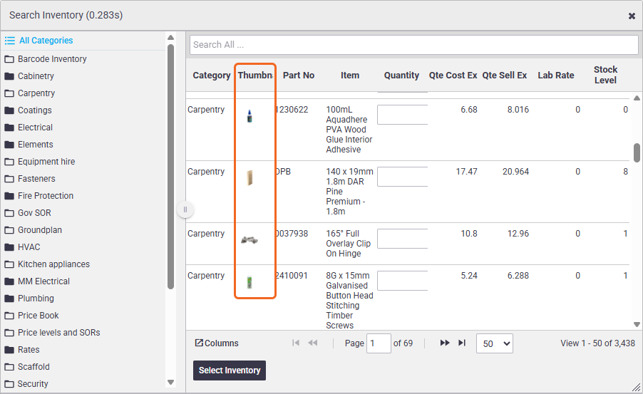 For example, when adding Inventory items to a quote or task, easily find the item in question by adding the Thumnail column. This shows each item's default photo on the inventory card.
